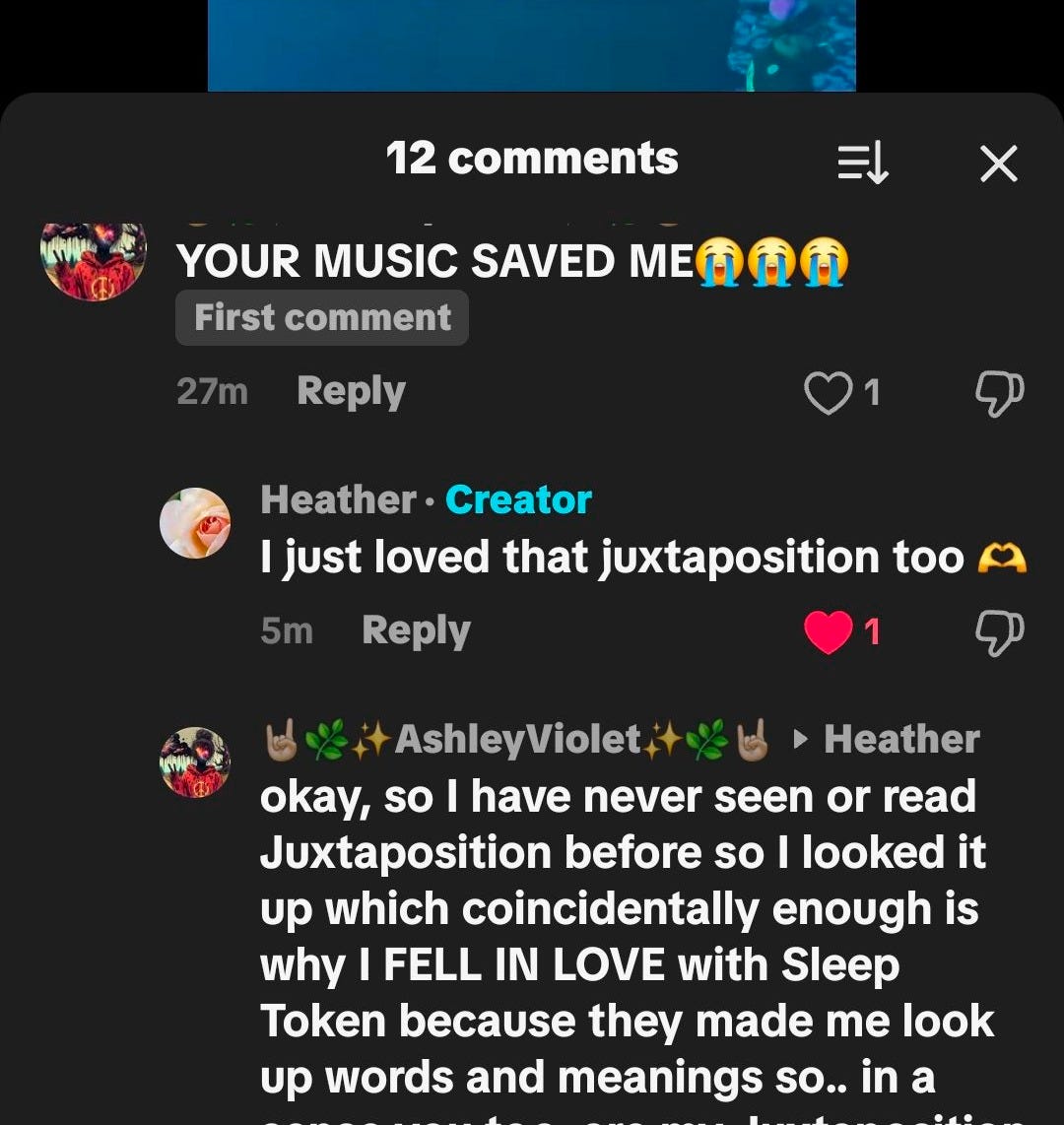 Sleep Token and Taylor Swift know, and are counting on, the fact that you are not going to listen to a song just once. You will listen a second time. And then again, and then couple days on repeat. They both are highly effective at dropping bread crumbs, hiding easter eggs, embedding foreshadowing and utilizing call backs that lead fans to the desire to deconstruct the lyrics line by line. It’s well thought out and intentional. I do no believe either of these artists has happy accidents.
